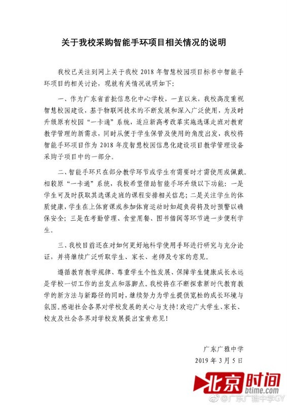 3月5日,@广东广雅中学GY对采购智能手环项目进行情况说明。说明中指出,智能手环项目为整个采购子项目中的一部分,只在部分教学环节或学生有需要时才需使用或佩戴。